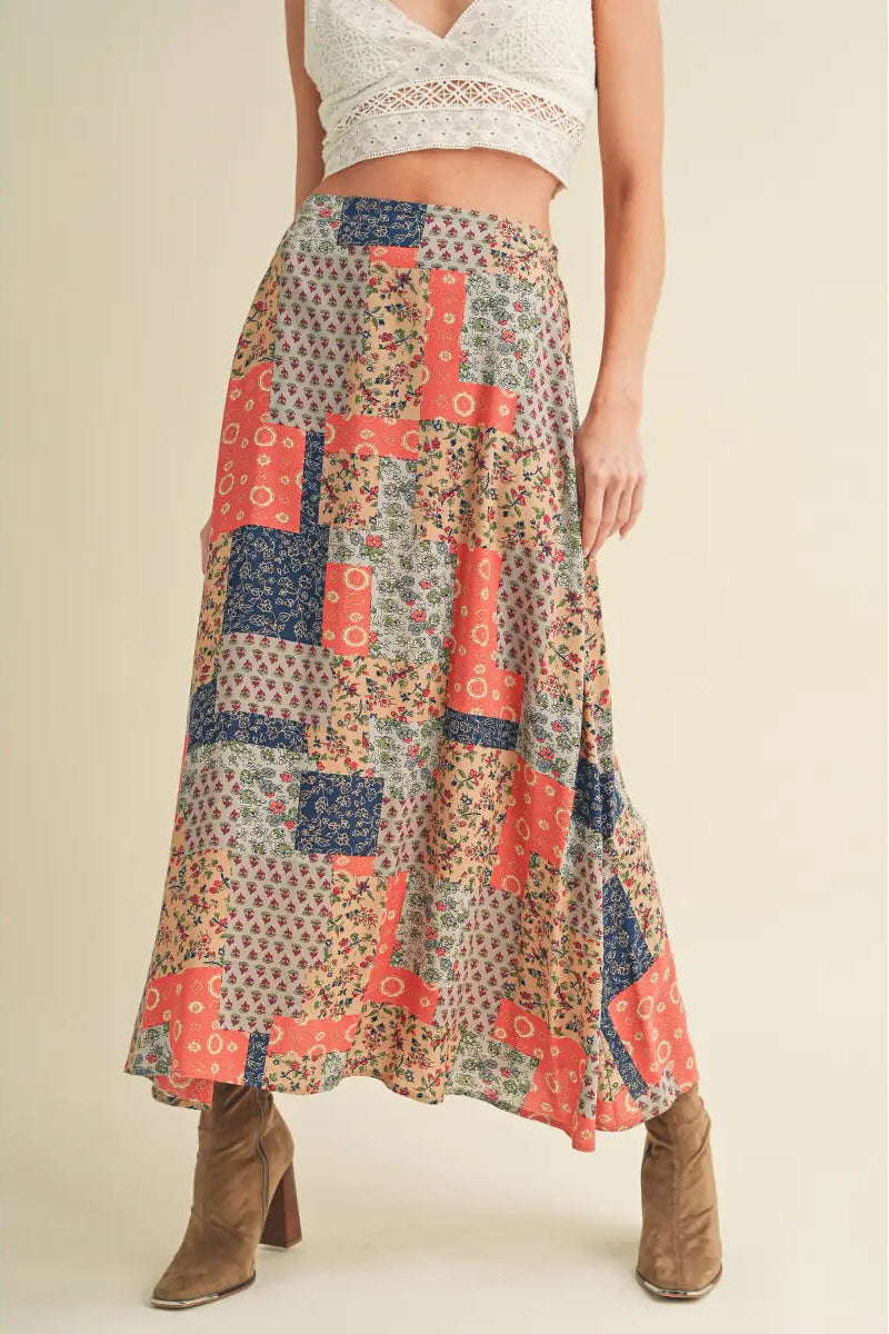 Sway with bohemian grace in this flowy maxi skirt. The elasticized back ensures a comfortable fit, while the patchwork print adds a free-spirited touch, making it the perfect choice for festival vibes. Embrace effortless style and movement in this whimsical addition to your wardrobe.