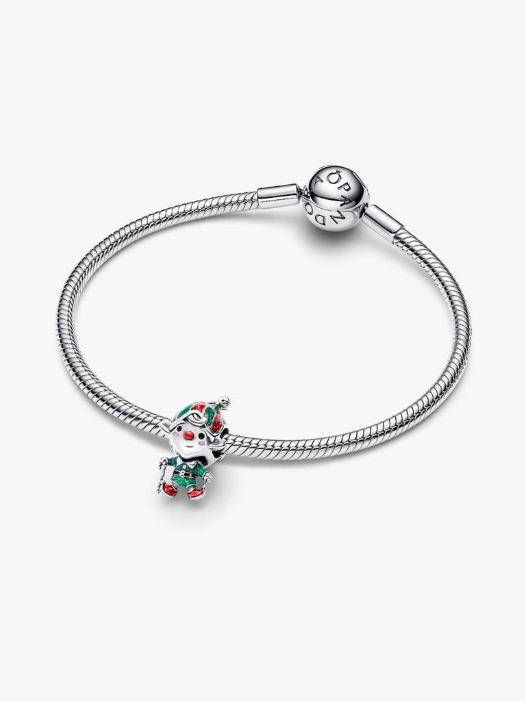 Meet your playful holiday guardian. This sterling silver charm features a moveable elf with vibrant, glittery enamel in festive colors. Crafted with intricate details, it adds a magical touch to your collection.