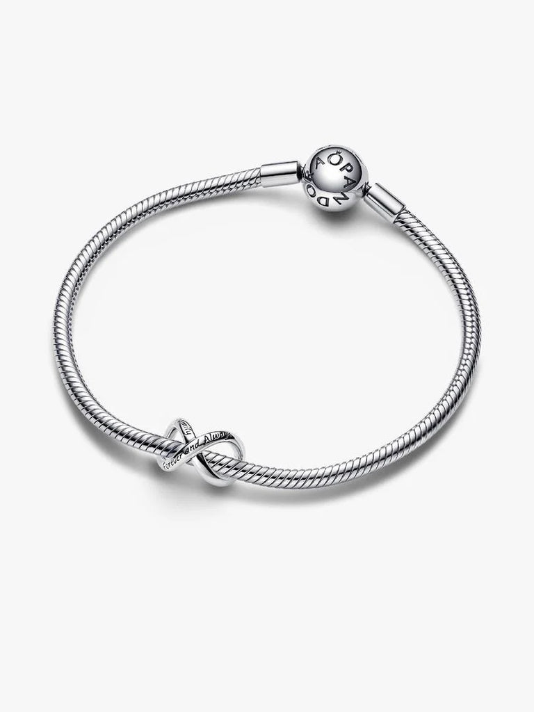 Keep eternal bonds close with our Forever & Always Infinity Charm, a unique piece crafted in sterling silver. Embracing the essence of family, the charm gracefully forms the infinity symbol, echoing the timeless nature of those cherished connections. Engraved with the heartfelt words 'Family' and 'Forever and Always,' this Pandora infinity charm captures the enduring spirit of kinship. Let it be a reminder that family is forever, and the joy found in their company is boundless.