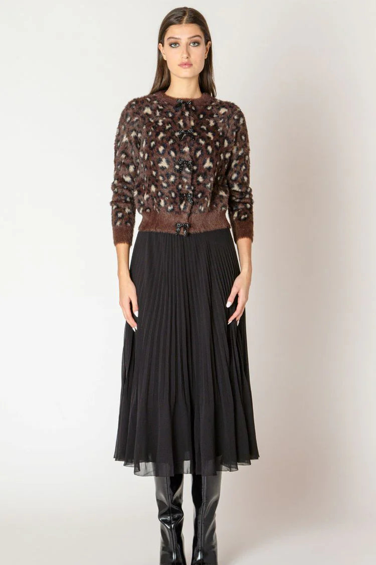 Add a fun and cozy touch to your outfits with this soft leopard print cardigan. Each button is decorated with a cute bow, giving it a playful detail that stands out. Perfect for layering on cooler days, this cardigan lets you show off a bold, lively style while staying comfortable.