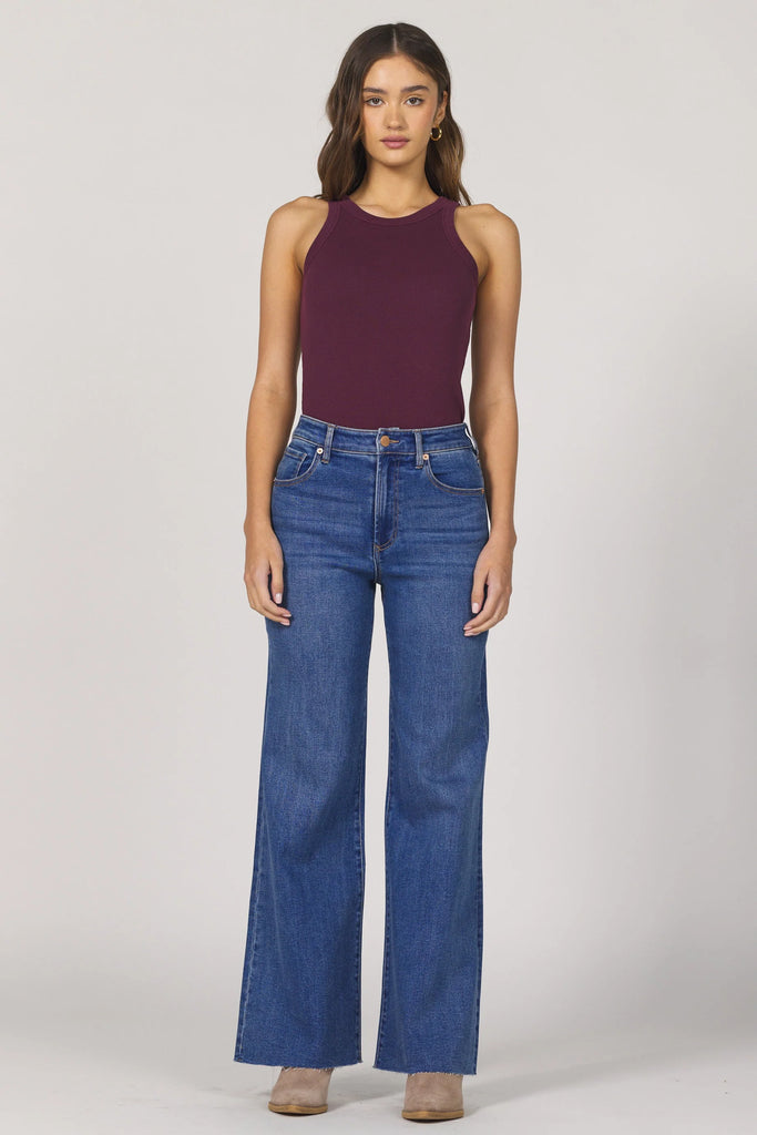 Elegance of the Fiona wide leg jean in Midtown wash, designed for the modern fits with high-rise that redefines chic with their cut-off hem, offering a contemporary twist on a classic silhouette.
