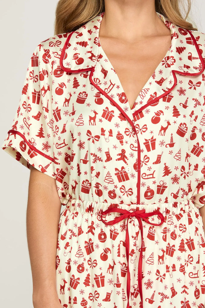 This short sleeve top and pants pajama set features a festive Christmas print, perfect for cozy holiday nights. Made for comfort and style, it’s an ideal choice for relaxing or sleeping during the season.