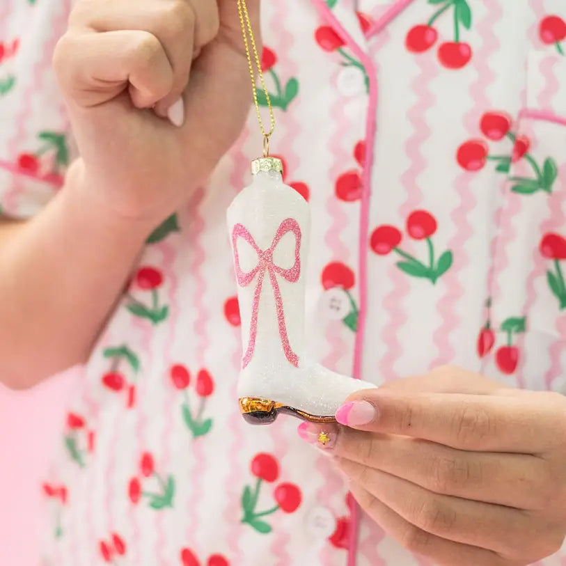 Cowboy Boot Christmas Ornament with Glitter Pink Bow