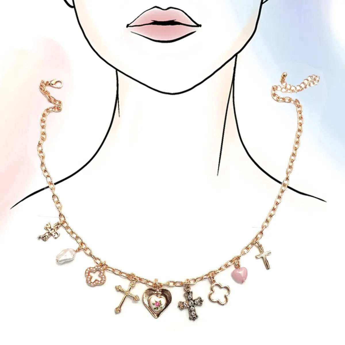 The Charm Necklace Clover, Cross, Porcelain Flower is a delicate and meaningful accessory that blends faith, luck, and beauty in one elegant design. Featuring a lucky clover, a timeless cross, and a finely crafted porcelain flower, this necklace offers a vintage inspired charm with a modern twist.