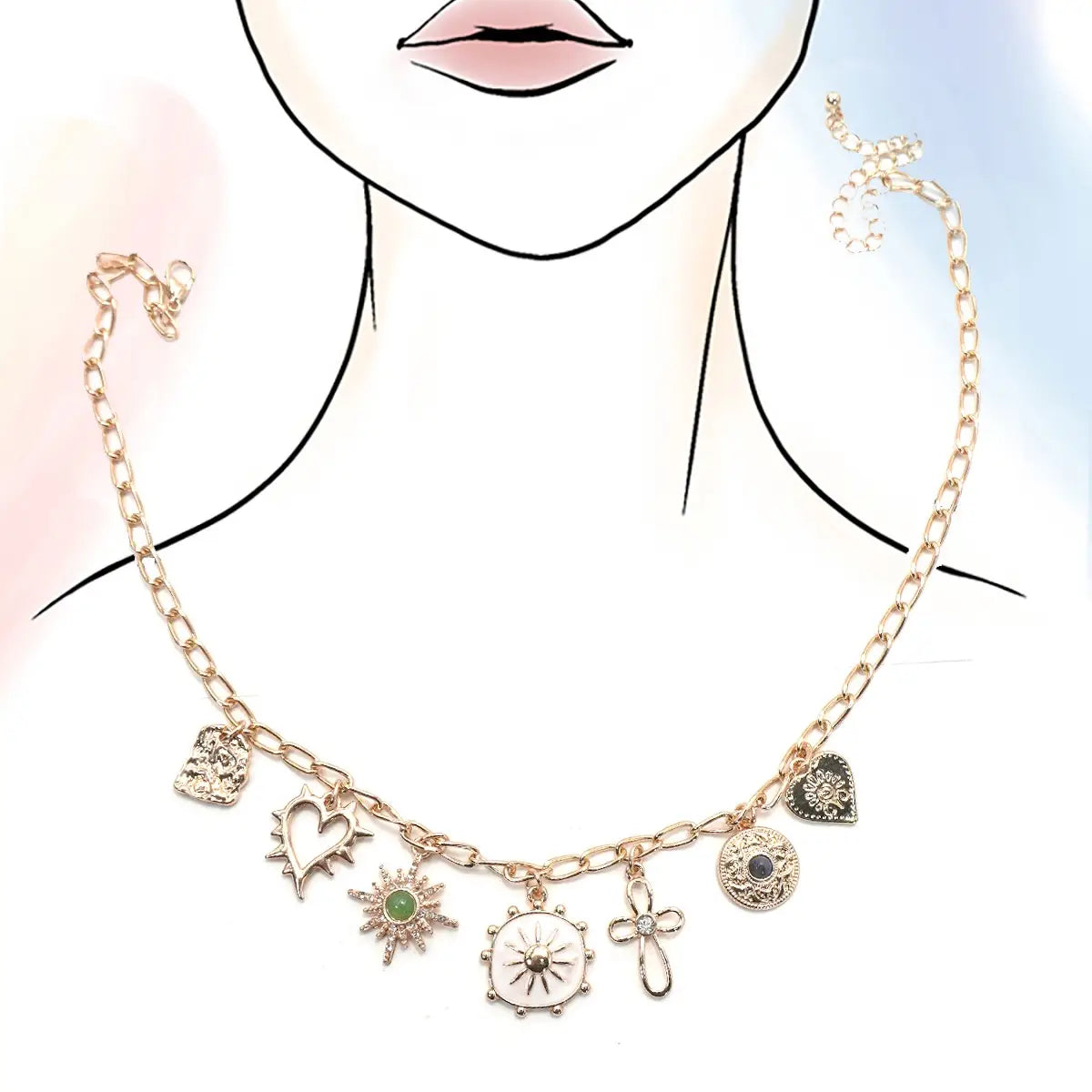 Charm Necklace a stunning mix of meaningful charms, including a Heart, Cross, Sunburst, and Stone, all beautifully strung on a delicate chain. The heart represents love, the cross symbolizes faith, the sunburst adds a burst of energy, and the stone provides a hint of natural elegance.