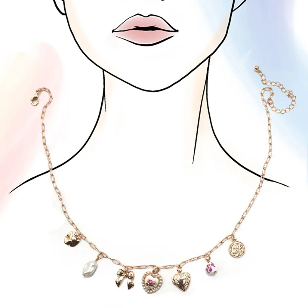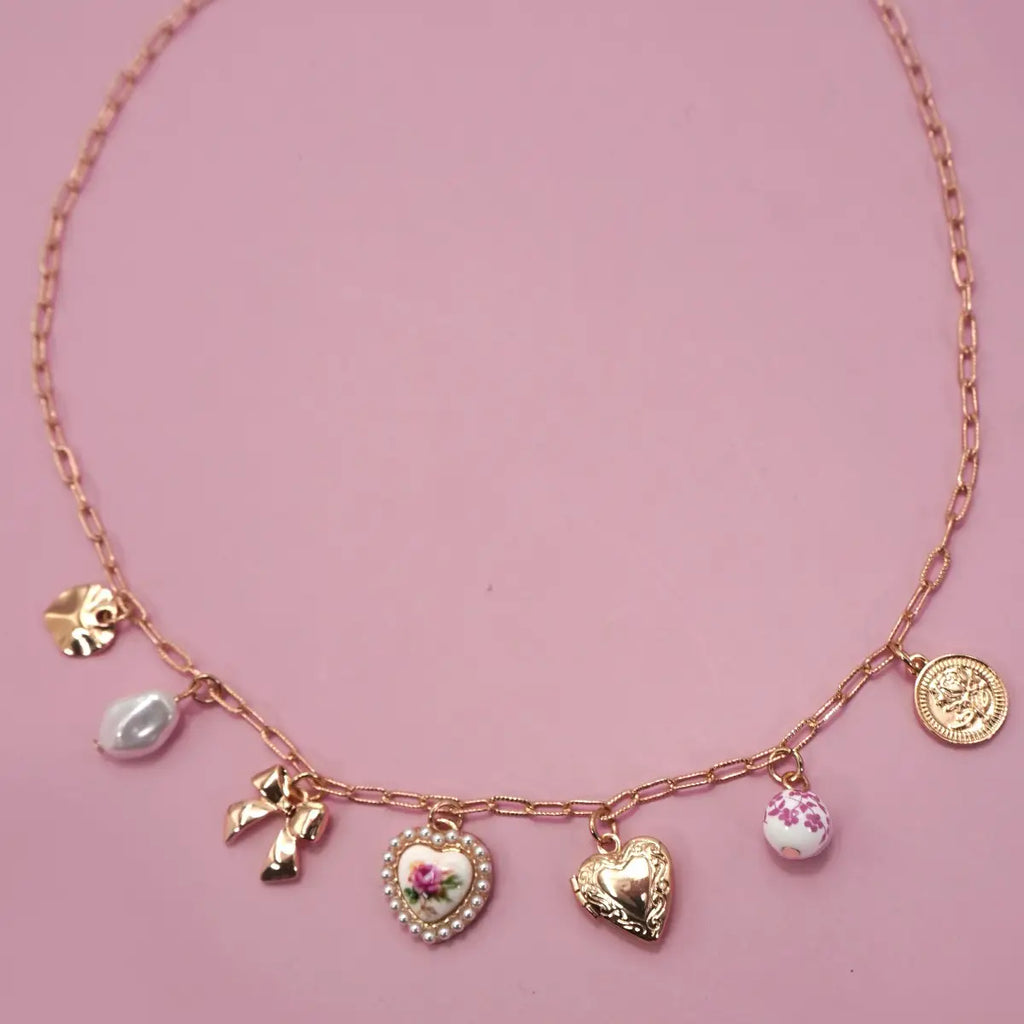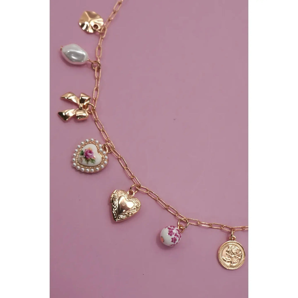 Pink Ceramic Porcelain Bow Heart Locket Multi-Charm Link Chain Necklace, featuring an enchanting mix of charms, including a delicate pink ceramic toile pattern bow, a heart-shaped locket, and other dainty accents, this necklace exudes charm on a fine, delicate link chain.