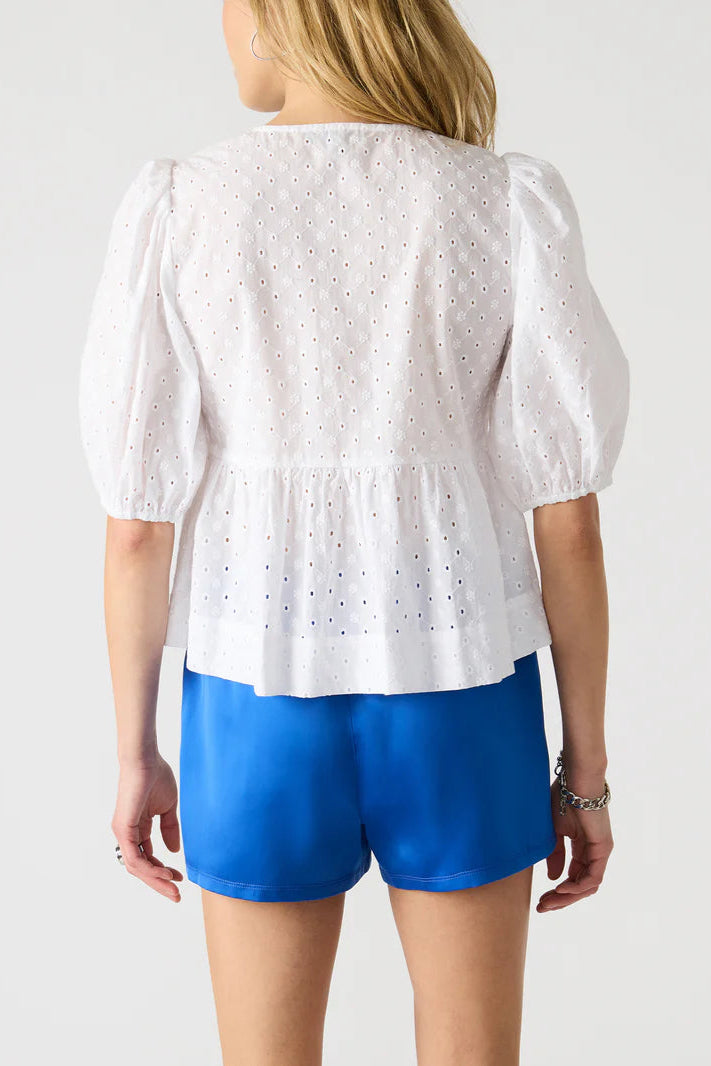 The PAULA top features stylish short-sleeved puff sleeves and a tie-front detail, accented by delicate eyelet detailing. This top offers a chic, modern look perfect for any occasion.