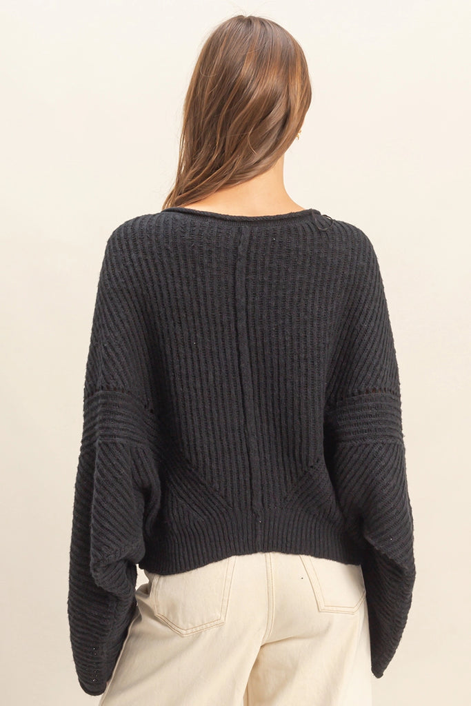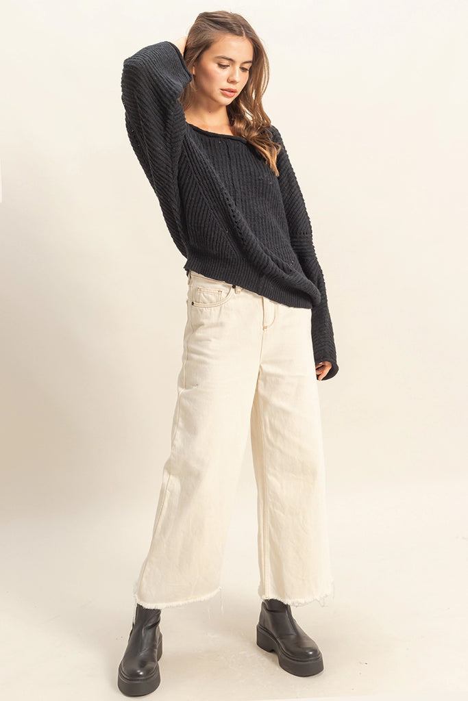 Effortlessly cozy with a touch of edge, this ribbed knit sweater features a slouchy, drop-shoulder silhouette that drapes beautifully on the body. The subtle directional ribbing adds textural interest, while the relaxed neckline and slightly oversized fit make it perfect for layering. Designed with everyday ease in mind, this versatile piece pairs just as well with casual cargos as it does with tailored bottoms. A go-to essential for laid-back days or cool evenings.