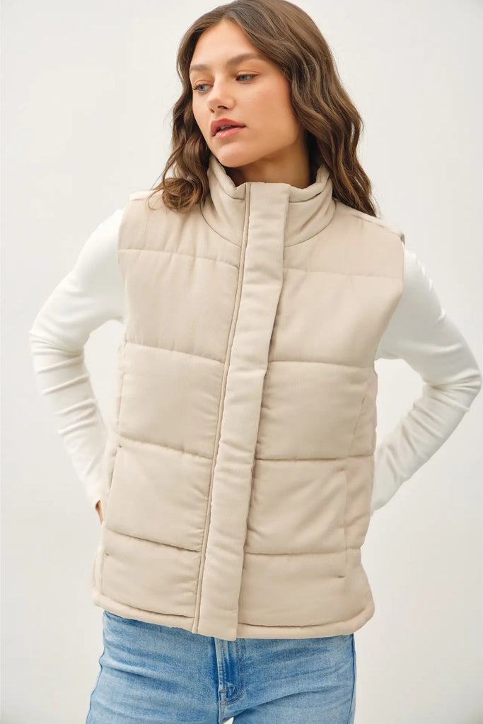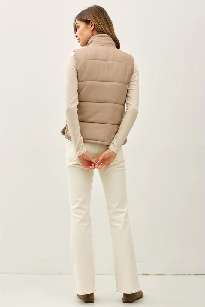 The Peyton Vest is your go-to layering piece for cooler months. This sleeveless puffer features a convenient zipper front with snap button closures, plus side pockets for everyday practicality. The cozy funnel neck and suede-like finish make it perfect for fall and winter wear over your favorite tees and sweaters.