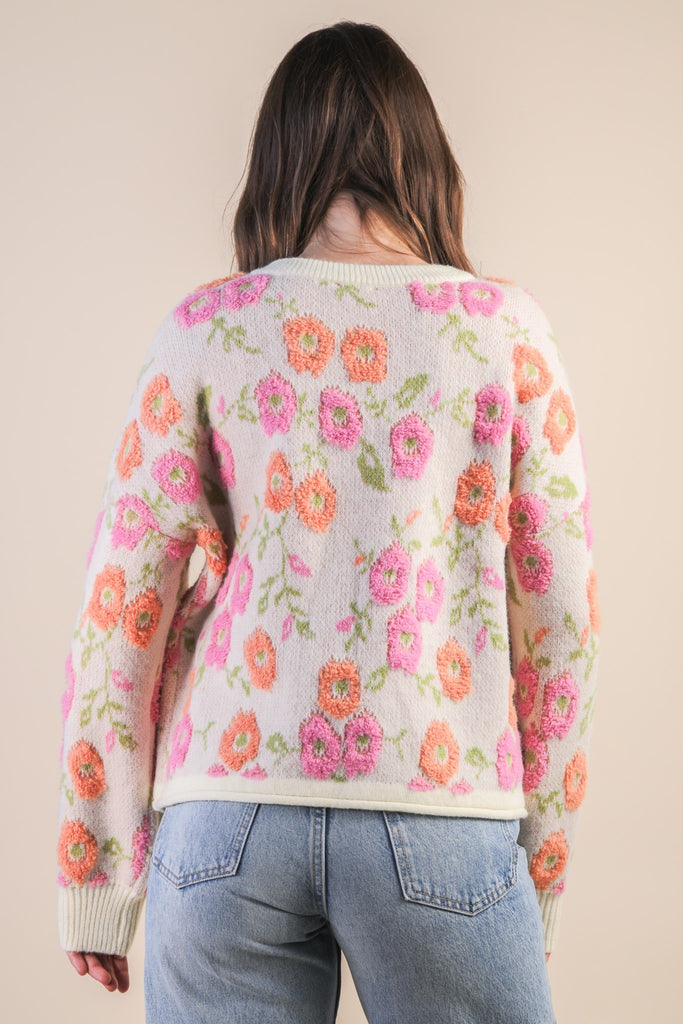 Embrace effortless style with this oversized floral textured knit sweater. Featuring a classic round neckline and relaxed drop shoulders, it's designed for comfort without sacrificing sophistication. The printed floral pattern adds visual interest to your everyday wardrobe, while the textured knit fabric provides warmth and dimension. Perfect for layering or wearing solo, this versatile piece transitions seamlessly from casual outings to cozy nights in.