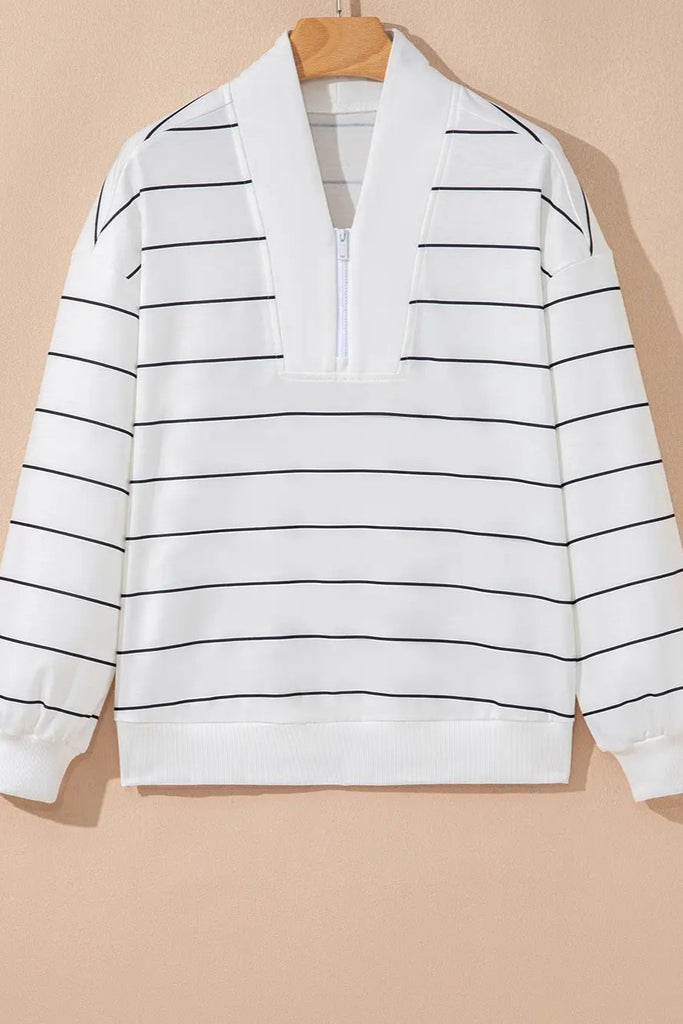 This white long-sleeve top features a casual stripe print and a relaxed drop shoulder design for added comfort. The V-neck with a zip detail adds a subtle stylish touch, making it perfect for everyday wear. Easy to pair and effortless to wear, it’s a versatile addition to your wardrobe.