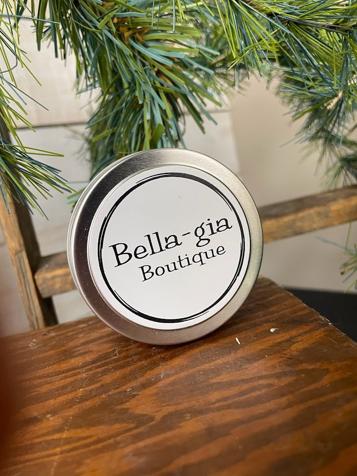 Bella-gia fragrance natural soy candle in a 4 oz. tin.