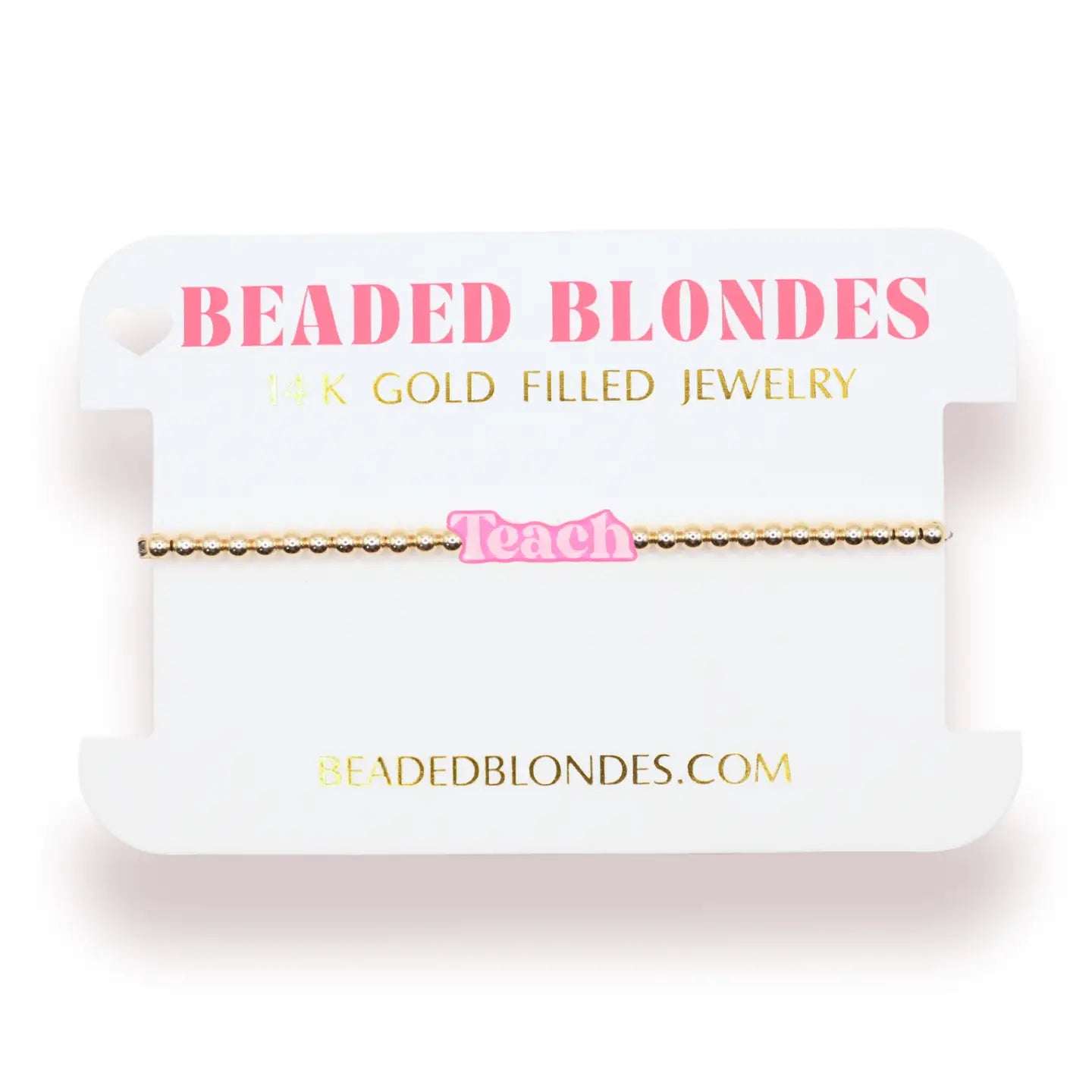 Get schooled in style with our Teach Bracelet! Perfect for teachers, this bracelet is both functional and fashionable. Show off your passion for education with this unique accessory - it's sure to be a hit in the classroom (and beyond)! Our signature 14 K gold filled beaded bracelets with custom made BB bead. *Limited quantities available* Made with 14 K gold filled tarnish proof beads and durable elastic string. Handstrung with love in College Station, Texas.