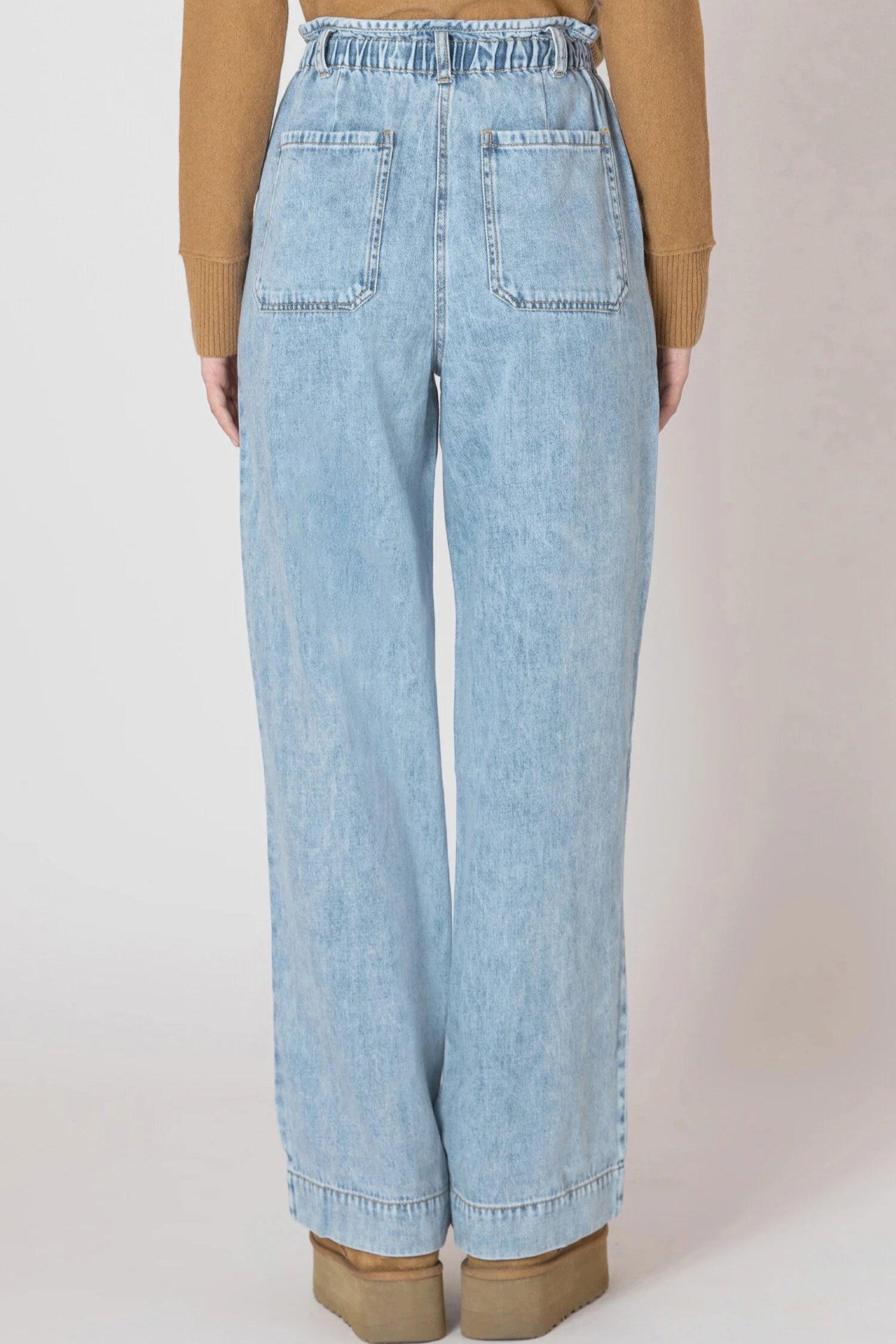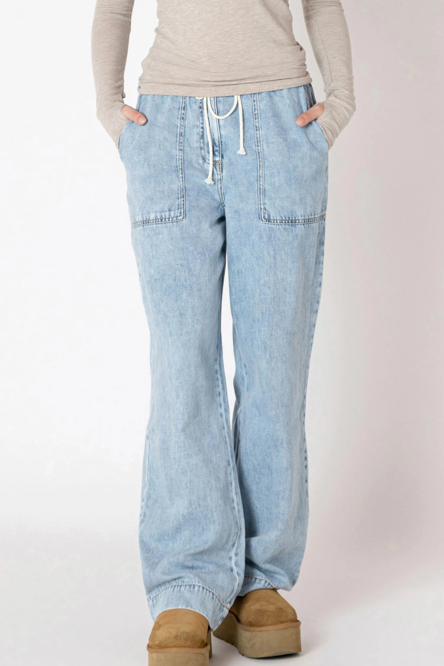 These washed blue denim pants offer a relaxed wide-leg fit and a drawstring waist for easy adjustment. With practical patch pockets, they combine comfort and casual style for everyday wear.