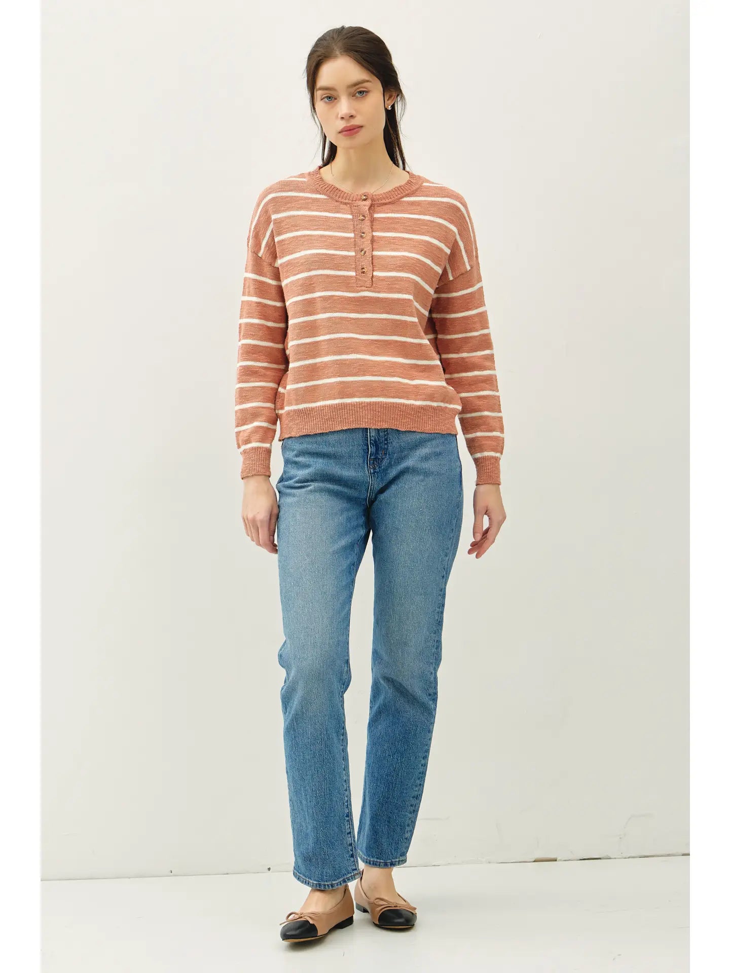 Striped Cotton Slub Henley Sweater This classic henley sweater combines comfort with timeless style. Crafted from soft cotton slub fabric, it features a subtle striped pattern and the signature henley neckline with button placket. The relaxed fit makes it perfect for layering or wearing solo, whether you're heading out for casual errands or settling in at home. A versatile wardrobe essential that works with jeans, chinos, or your favorite pants.