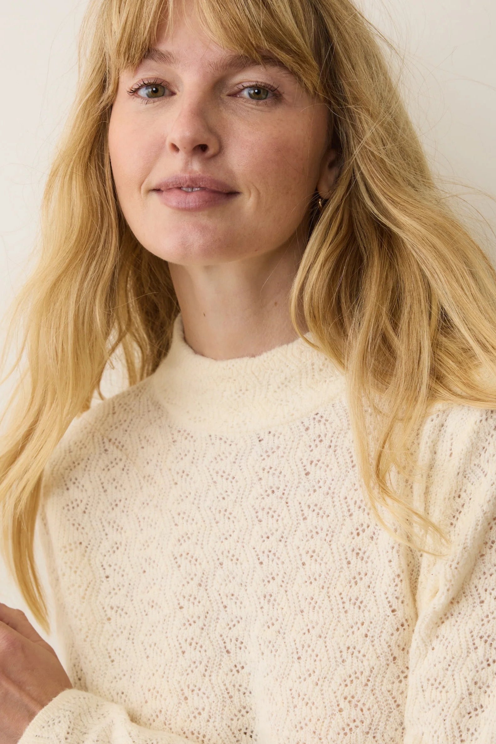 The fabric for this sweater is a soft knit with an open pointelle stitch. Effortlessly elevates any outfit, and just amazing for layering.