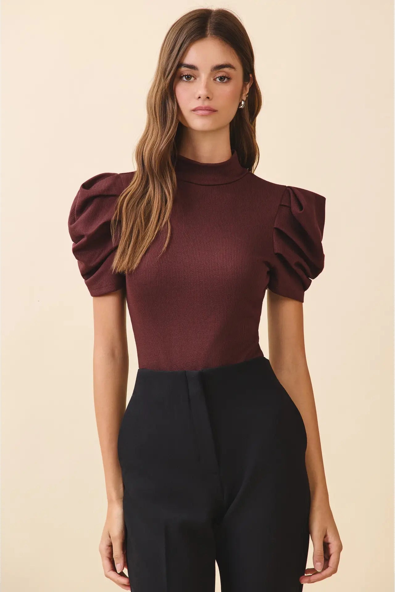 Stretch knit bodysuit with a mock neck and short puff sleeves for a flattering fit. Features a back cutout with loop-button closure and snap-button front for easy wear. The thong-back design eliminates visible panty lines under any outfit. Perfect for layering or wearing solo, this versatile piece transitions seamlessly from day to night.