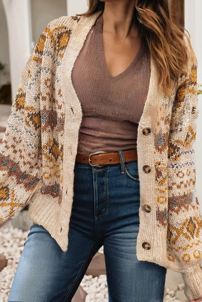 This Western Pattern Cardigan features a cozy knitted design with a classic V-neck and button closure. Its unique western-inspired pattern adds style while keeping you warm and comfortable, perfect for layering during cooler days.
